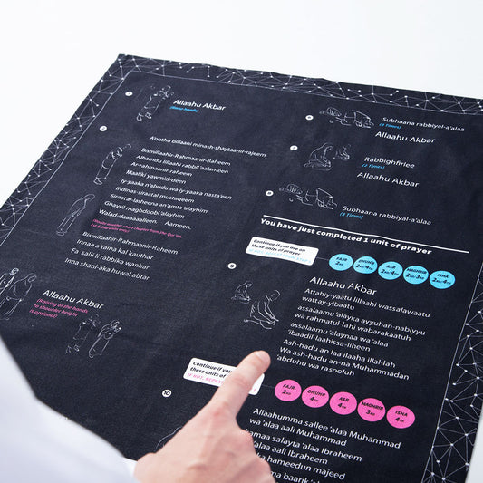 A uniquely designed product providing step-by-step instructions to learn how to pray. Using the guided prayer rug you can now learn to pray simply and easily, dramatically reducing the time it takes to grasp this rewarding and obligatory pillar!